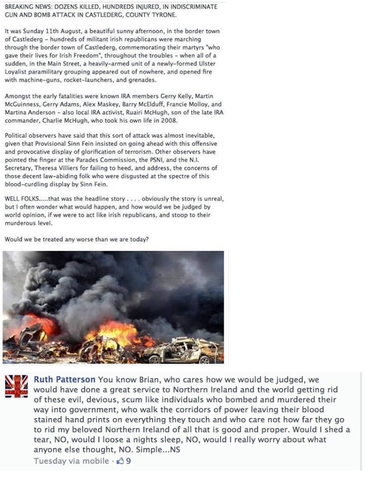 Ruth Patterson: Words are not enough By Loyalists against Democracy on 6:10 PM Ruth Patterson is our new favourite loyal loyalist What a woman. Supporting massacre and mass murder marks her out as Ulster's tap bitter sectarian oul trout. She would make a fine leader of the TUV once Jim Allister pops his clogs. Well done Ruth! Ruth Patterson Facebook massacre comments